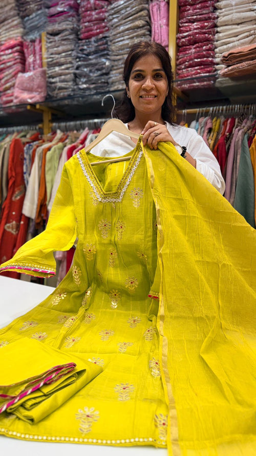 Yellowish Green Mul Chanderi Suit Set