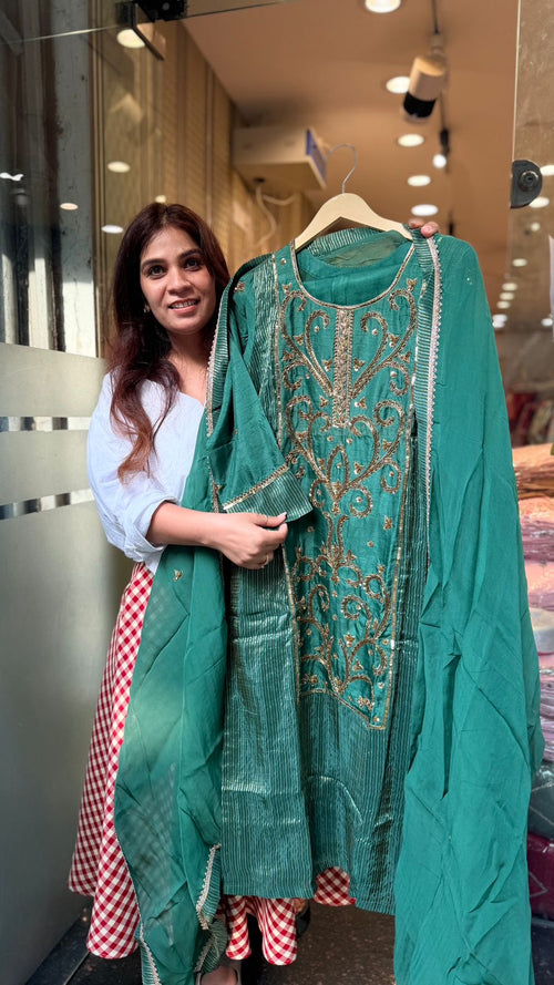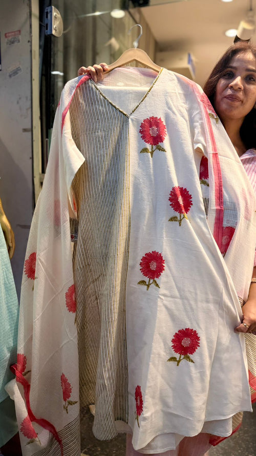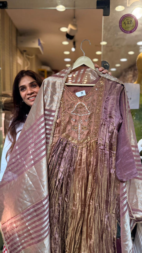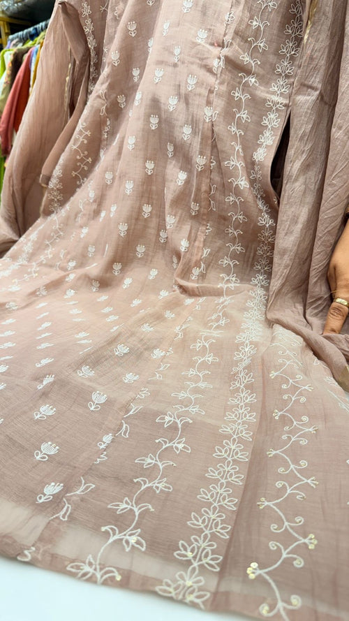 A refined celebration of color and craftsmanship, this Mul Chanderi series brings together soft hues and timeless elegance. Designed in a palette of soothing tones, each piece highlights delicate detailing and graceful silhouettes that feel effortlessly elevated.